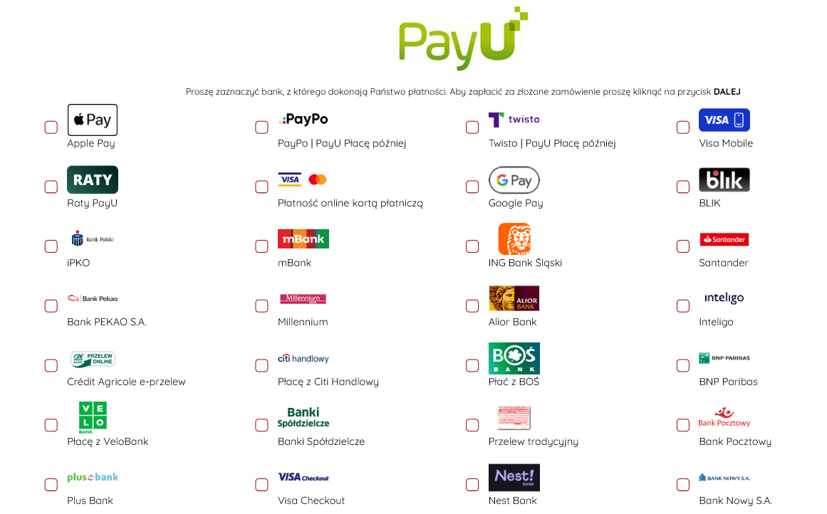 W naszym sklepie wykorzystujemy system płatności PayU, do którego zostaniesz przekierowany w celu dokonania płatności.
